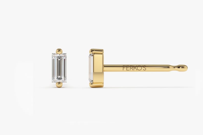 Brilliant baguette-cut diamond studs, meticulously crafted in solid gold, radiating timeless elegance with every sparkle.